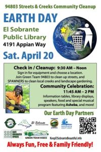 Green Team 94803 invites you to our next Monthly Third Saturday Cleanup on February 17, rain or shine and also to our annual Earth Day Cleanup on April 20. Both events at El Sobrante Public Library. We bring the gear, all you have to do is be here. Our events are always fun and free! More information to come at KeepElSobranteBeautiful.info, and be sure to read our article on the Chamber website at: elsobrantechamber.com/category/blog/newsletter-articles/